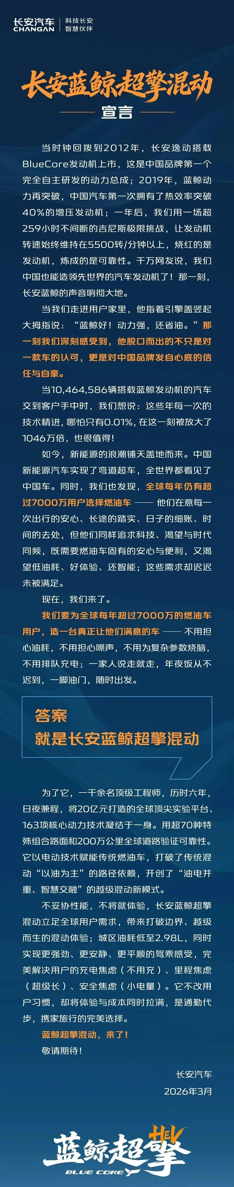 长安汽车表示,中国新能源汽车实现了弯道超车,全世界都看见了中国车,但全球每年仍有超过7000万用户选择燃油车。究其原因,是因为他们既需要燃油车的安心与便利,又渴望低油耗、好体验、还智能。这些需求迟迟未被满足。基于此,长安汽车投入一千余名顶级工程师,历时6年日夜兼程,将20亿元打造的全球顶尖实验平台、163项核心动力技术凝结于一身,并用超70种特殊组合路面和200万公里全球道路验证可靠性,打造出“蓝鲸超擎混动”——用户不用担心油耗和噪声,不用为复杂参数烧脑,不用排队充电,就能收获新能源的电感体验。